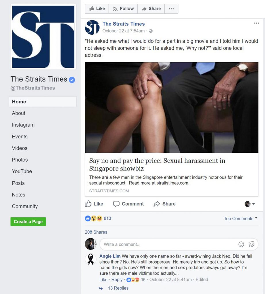 On Saturday, The Straits Times teased an “exposé” that would be in the next day’s papers, hinting at the possibility of revealing a Harvey Weinstein-esque scandal within local showbiz.
