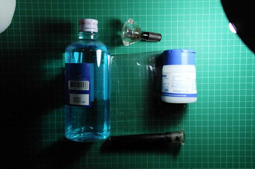 เอาแอลกอฮอลที่เตรียมไว้ เทใส่ถุงซิปล๊อคทั้งสองจนกว่าจะท่วมชิ้นส่วนนั้นๆ
